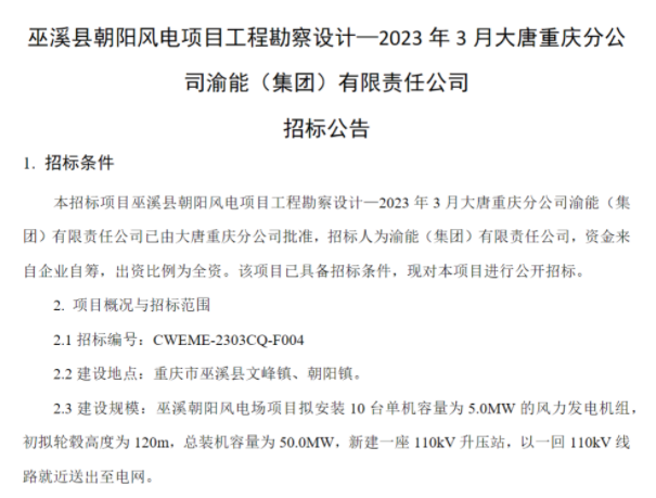 公告顯示,巫溪朝陽(yáng)風(fēng)電場(chǎng)項(xiàng)目位于重慶市巫溪縣文峰鎮(zhèn)、朝陽(yáng)鎮(zhèn),擬安裝 10臺(tái)單機(jī)容量為 5.0MW的風(fēng)力發(fā)電機(jī)組,初擬輪轂高度為 120m,總裝機(jī)容量為 50.0MW,新建一座 110kV升壓站,以一回 110kV線路就近送出至電網(wǎng)。