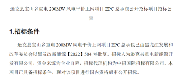 公告顯示,遜克縣寶山鄉(xiāng)重電200MW風(fēng)電平價(jià)上網(wǎng)項(xiàng)目位于黑龍江省黑河市遜克縣寶山鄉(xiāng)境內(nèi),場址中心距遜克縣城直線距離約50km,規(guī)劃裝機(jī)總?cè)萘繛?00MW,一次性建設(shè)完成,風(fēng)電場擬安裝32臺(tái)H193-6.25MW機(jī)型。