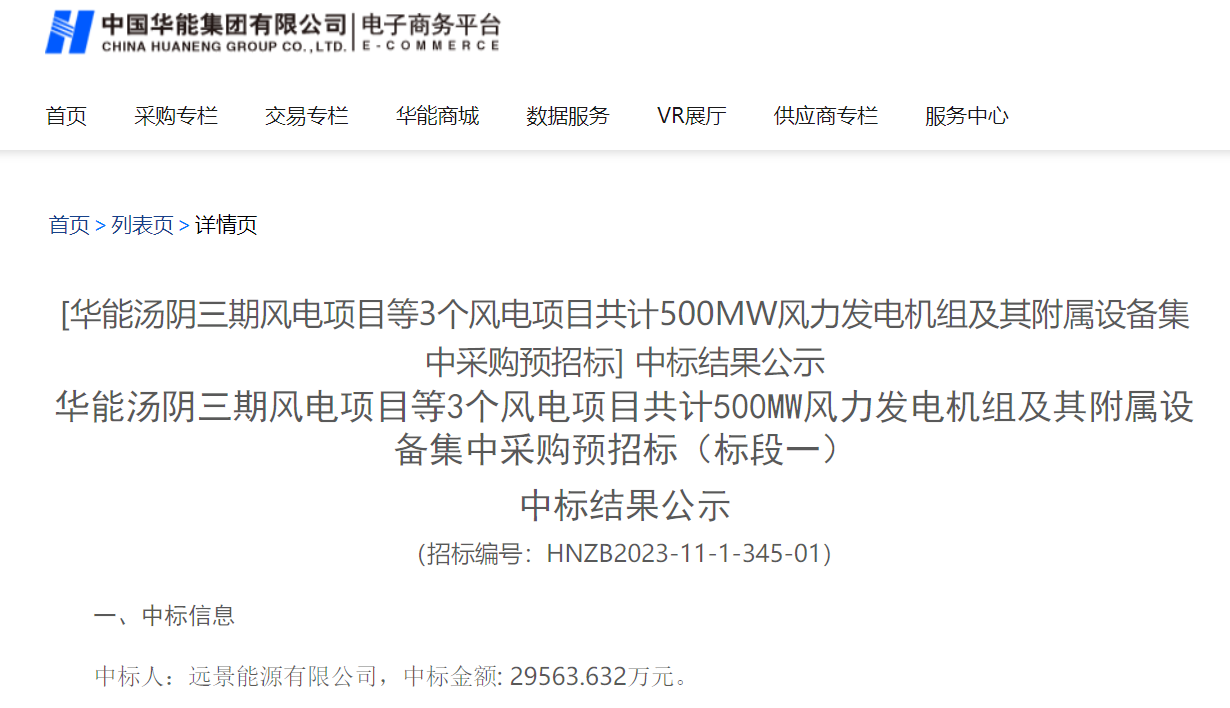 2月24日,華能集團電子商務平臺發(fā)布《華能湯陰三期風電項目等3個風電項目共計500MW風力發(fā)電機組及其附屬設備集中采購預招標(標段一)中標結果公示》的公告。