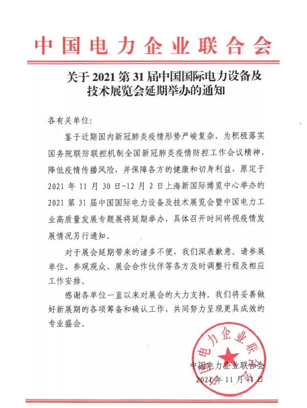 鑒于近期疫情防控形勢趨于嚴峻,為了貫徹落實國務院聯(lián)防聯(lián)控機制防疫要求,以所有參展商與觀眾的健康安全為首要考慮,同時保障展會效果,原定于 2021年11月30日至12月2日在上海新國際博覽中心舉辦的「第三十一屆上海國際電力設備及技術展覽會」暨「第二十三屆上海國際電工裝備展覽會」延期舉辦。具體延期方案將根據(jù)政府疫情防控規(guī)定另行通知。