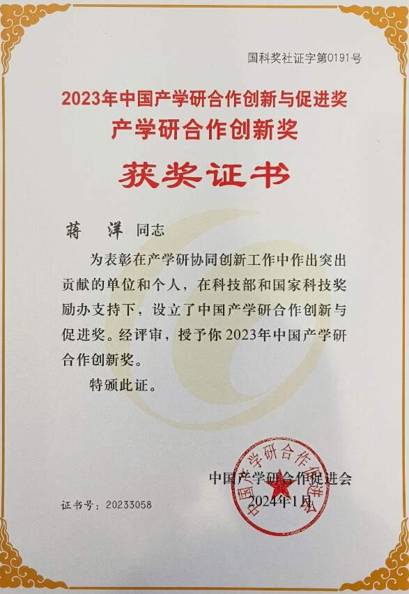 中國(guó)產(chǎn)學(xué)研合作創(chuàng)新與促進(jìn)獎(jiǎng)經(jīng)科技部和國(guó)家科技獎(jiǎng)勵(lì)辦批準(zhǔn),由中國(guó)產(chǎn)學(xué)研合作促進(jìn)會(huì)設(shè)立,每年評(píng)選一次,旨在表彰產(chǎn)學(xué)研創(chuàng)新合作工作中做出突出貢獻(xiàn)的先進(jìn)單位和個(gè)人,是我國(guó)產(chǎn)學(xué)研界協(xié)同創(chuàng)新的最高榮譽(yù)獎(jiǎng)。2023年,蔣洋大力踐行中國(guó)能建《若干意見(jiàn)》及“1466”戰(zhàn)略,引領(lǐng)綠色建材公司開(kāi)辟了能源新材料和基建新材料兩個(gè)全新的業(yè)務(wù)板塊。與北京錦石光宇新能源有限公司聯(lián)合研發(fā)的新一代BIPV組件,一經(jīng)推出就收獲了國(guó)內(nèi)外大批合作意向,獲得中國(guó)BIPV十大品牌獎(jiǎng),與日本東京大學(xué)、土與蔬菜株式會(huì)社聯(lián)合研發(fā)的“基于工農(nóng)業(yè)固廢再生土壤的創(chuàng)新技術(shù)”,獲2023(第四屆)國(guó)際碳中和與綠色投資大會(huì)“零碳中國(guó)”十大創(chuàng)新技術(shù)。