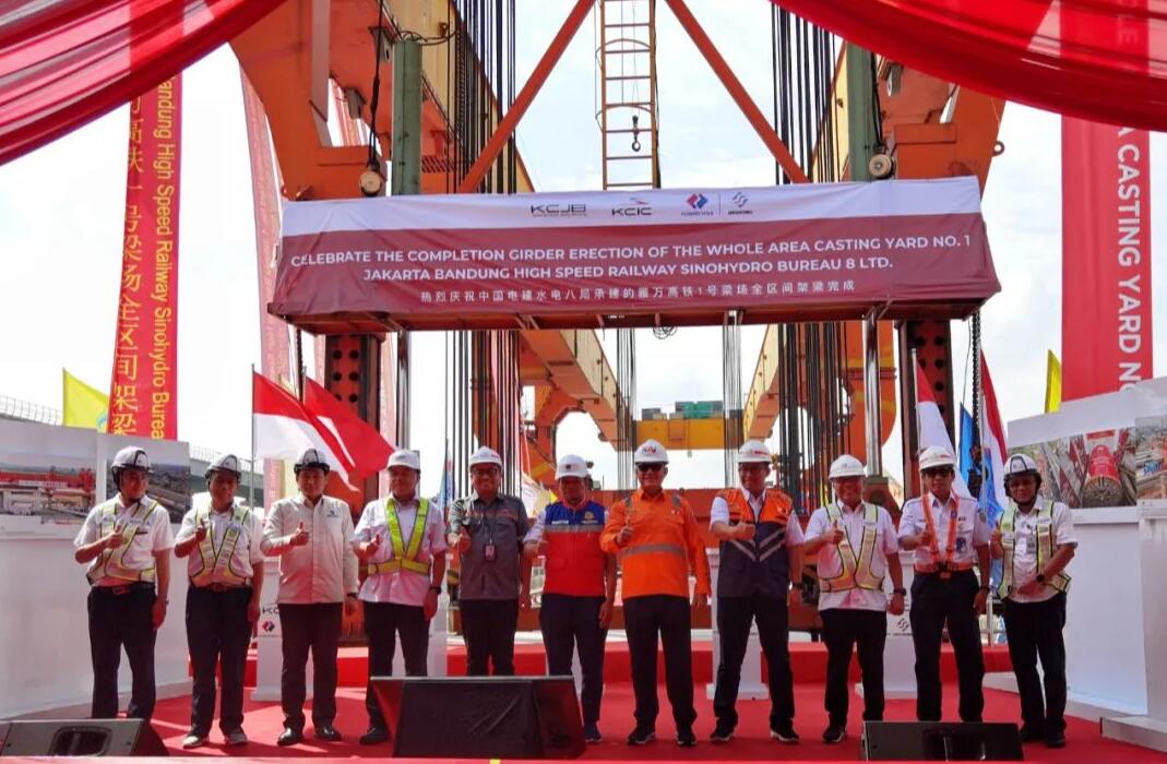 雅萬高鐵全線共設3座梁場,負責整個榀箱梁預制及架設任務,1號和2號梁場由中國電建承擔施工任務。其中,水電七局承建的2號梁場是全線首家高質量通過認證的制梁場,水電八局承建的1號梁場是中國高鐵海外最大制梁場。2022年10月16日,2座梁場全面完成了全線架梁工程。