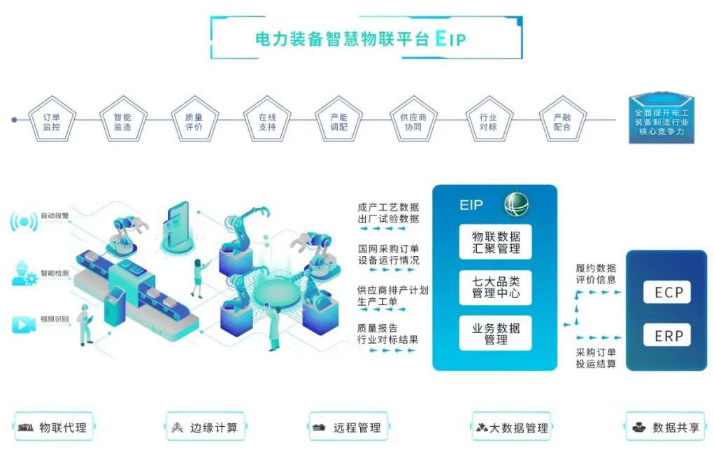 EIP包括工廠側(cè)供應商數(shù)據(jù)采集中心(供應商側(cè)工作)、智慧物聯(lián)網(wǎng)關、智慧物聯(lián)品類管理中心、智慧物聯(lián)管理模塊四部分,構(gòu)建智能監(jiān)造、訂單跟蹤、產(chǎn)能分析、在線支持、質(zhì)量評價、行業(yè)對標、履約協(xié)同、產(chǎn)融融合等核心功能。