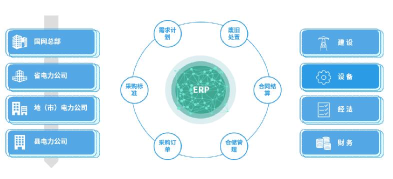 企業(yè)資源管理系統(tǒng)ERP(Enterprise Resource Planning,簡稱ERP)著力實現(xiàn)“資源一盤棋”,通過與ECP、EIP等系統(tǒng)緊密集成,總部、省、市、縣縱向體系貫通,設備、經(jīng)法、財務等橫向?qū)I(yè)協(xié)同,實現(xiàn)采購訂單、庫存物資、資金結(jié)算等企業(yè)資源統(tǒng)籌管控。該系統(tǒng)主要由計劃管理、合同管理、倉儲管理和廢舊物資處置管理四個業(yè)務子模塊組成。