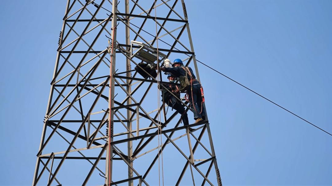 圖為作業(yè)人員正在為處于泄洪區(qū)的桿塔安裝電力北斗桿塔傾斜監(jiān)測(cè)終端
