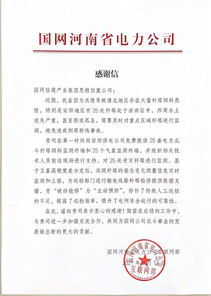 “貴司在第一時(shí)間向安陽(yáng)供電公司免費(fèi)提供的25套電力北斗桿塔傾斜監(jiān)測(cè)終端和25個(gè)氣象監(jiān)測(cè)終端,為運(yùn)檢部門(mén)進(jìn)行輸電線路桿塔檢修提供數(shù)據(jù)支撐,提高了巡檢效率,提升了電網(wǎng)安全運(yùn)行的可靠性……”8月17日,國(guó)網(wǎng)信通產(chǎn)業(yè)集團(tuán)思極位置(吉奧)收到一封來(lái)自國(guó)網(wǎng)河南電力的感謝信,信中對(duì)國(guó)網(wǎng)信通產(chǎn)業(yè)集團(tuán)思極位置(吉奧)在本次搶險(xiǎn)救災(zāi)保電中給予的大力支持表示由衷感謝。