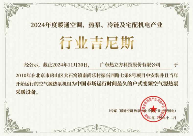 熱泵行業(yè)媒體i傳媒近日向熱立方地暖機(jī)頒發(fā)了一項榮譽(yù)——中國市場運(yùn)行時間最久的戶式變頻空氣源熱泵采暖設(shè)備。據(jù)了解,該設(shè)備于2010年在北京市房山區(qū)大石窩鎮(zhèn)南尚樂村振興西路七條8號項目中安裝,并且當(dāng)年開始運(yùn)行,歷經(jīng)15個供暖季后,依然穩(wěn)定運(yùn)行無故障,創(chuàng)造了中國市場運(yùn)行時長的行業(yè)紀(jì)錄。該項檢測由“建筑環(huán)能科技有限公司建筑環(huán)境與能源檢測院”完成檢測認(rèn)證。