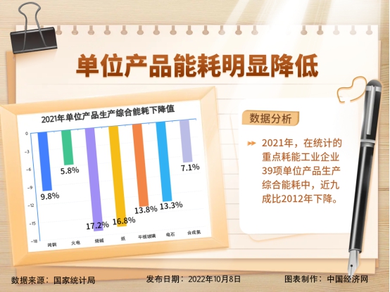 通過(guò)推動(dòng)工藝升級(jí)、更新改造用能設(shè)備、加快淘汰落后產(chǎn)能、推廣高效節(jié)能技術(shù),單位產(chǎn)品綜合能耗不斷下降。2021年,在統(tǒng)計(jì)的重點(diǎn)耗能工業(yè)企業(yè)39項(xiàng)單位產(chǎn)品生產(chǎn)綜合能耗中,近九成比2012年下降。其中,噸鋼綜合能耗下降9.8%,火力發(fā)電煤耗下降5.8%,燒堿、機(jī)制紙及紙板、平板玻璃、電石、合成氨生產(chǎn)單耗分別下降17.2%、16.8%、13.8%、13.3%、7.1%。