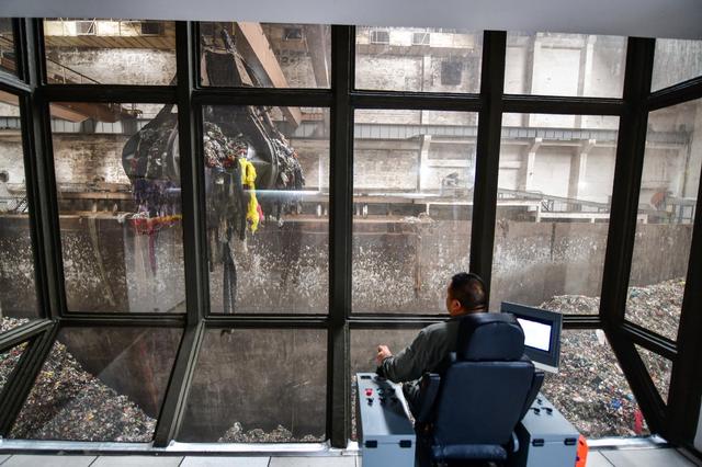 9月19日,在山東啟迪濟能環(huán)??萍加邢薰?,工作人員在控制室內(nèi)操作設(shè)備吊運垃圾。