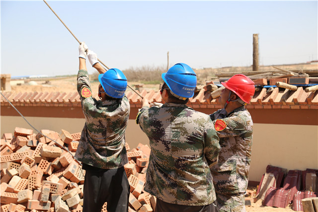 施工當(dāng)天烏海地區(qū)高溫來襲,施工難度陡增,六五四供電分局黨員突擊隊成員在三十五攝氏度的高溫下,頭頂烈日、腳踏電桿。按照分工干脆利落的進行立桿、安裝橫擔(dān)、緊線等工作。經(jīng)過3個小時的作業(yè),終于順利地為此貧困戶送上電。貧困戶張占飛的母親非常激動。“原先以為只是簡單修一下,沒想到還需要這么多步驟,他們做得這么細致、這么認真,真的是非常感謝他們。”