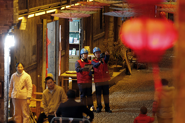 “我是江蘇籍的,與你們一樣,響應(yīng)疫情防控號(hào)召就地過(guò)年,留在崗位上,沖在第一線。”為了扮靚前童,國(guó)網(wǎng)寧??h供電公司從年前就開(kāi)始組織國(guó)家電網(wǎng)浙江電力(寧海)紅船共產(chǎn)黨員服務(wù)隊(duì)前童保電小分隊(duì)。由江蘇籍員工儲(chǔ)海峰擔(dān)任隊(duì)長(zhǎng)。“從年前開(kāi)始,我們就跟當(dāng)?shù)卣吐梦?、古?zhèn)對(duì)接春節(jié)期間古鎮(zhèn)保電細(xì)節(jié),承擔(dān)古鎮(zhèn)地下、墻內(nèi)、墻上供電線路的巡檢以及協(xié)助古鎮(zhèn)對(duì)燈光秀線路的用電隱患排查”儲(chǔ)海峰繼續(xù)說(shuō)道。