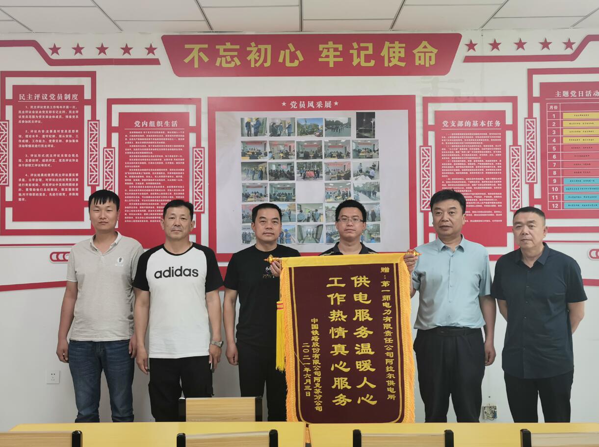 中國鐵塔阿克蘇分公司負責人蔣羽將一面寫著“供電服務溫暖人心·工作熱情真心服務”的錦旗送到一師電力阿拉爾供電所負責人手中,對他們優(yōu)質、高效的供電服務贊不絕口。