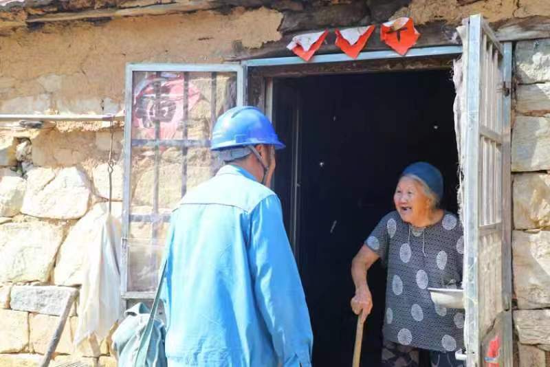 土家窯自然村坐落在玖山腳下,半山腰上還有7戶(hù)老人,只有一條羊腸小道能到達(dá)。7月7日下午,山上的王繼福托人打電話(huà),說(shuō)家里沒(méi)電了,水缸也空了,沒(méi)法抽水。遲玉朋急匆匆趕了去,92歲的王繼福和老伴已經(jīng)挑不動(dòng)水了,老倆口只能靠電機(jī)抽水用。遲玉朋扛著梯子、背著工具包,從山下爬到山腰,午后天氣超乎異常的悶熱,汗水很快浸透衣服。