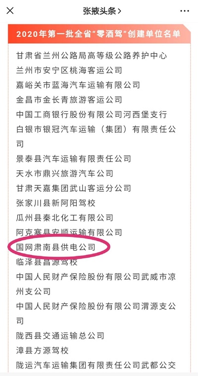 國網(wǎng)張掖肅南縣供電公司榮獲2020年甘肅省第一批“零酒駕”創(chuàng)建單位