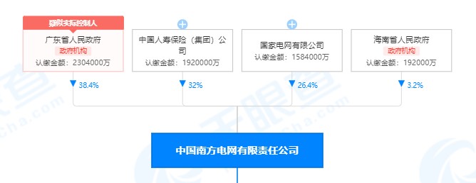 根據(jù)公開資料查詢,本次調整前中國南方電網(wǎng)總注冊資本為600億元。共有4家股東,股本比例是:廣東省人民政府出資230.4億,占比38.4%,為第一大股東,中國人壽保險(集團)公司出資192億,占比32%,排名第二,國家電網(wǎng)有限公司出資158.4億,占比26.4%,排名第三,海南省人民政府認繳19.2億,占比3.2%,排名最末。