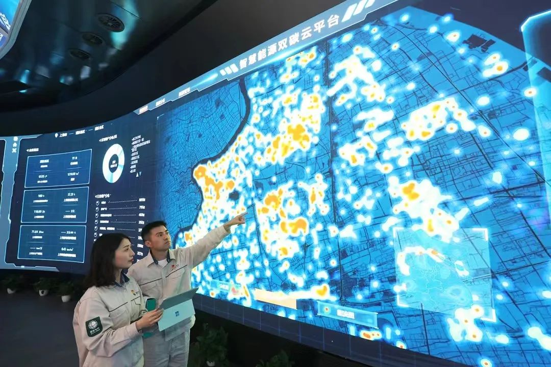 ▲國網上海電力員工利用智慧能源雙碳云平臺為用戶定制節(jié)能減排方案