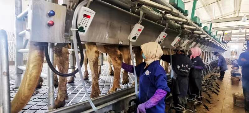 擠奶車間里,黑白相間的奶牛列隊(duì)走上緩緩轉(zhuǎn)動(dòng)的擠奶轉(zhuǎn)臺(tái),工人們依次對它們進(jìn)行采奶前的乳頭清洗消毒工作,隨后,德國原裝進(jìn)口轉(zhuǎn)盤擠奶機(jī)對奶牛進(jìn)行自動(dòng)擠奶??粗还晒蓾嵃椎娜橹鬟M(jìn)容器,場長郭宏勝露出喜悅的笑容。