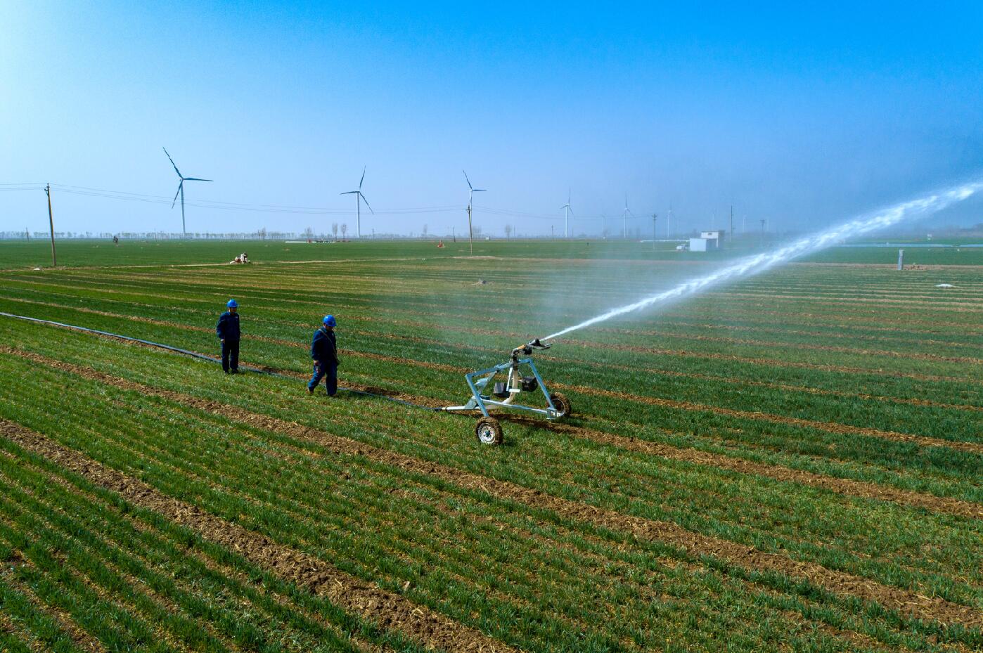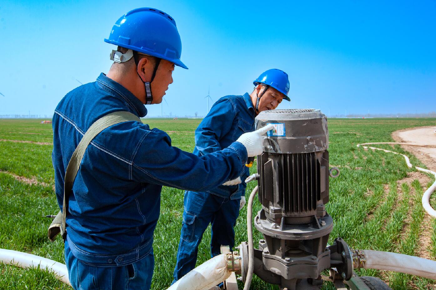 春撫萬物,水潤“糧倉”。在“豫北糧倉”滑縣麥田里,噴灌機(jī)正在努力工作,源源不斷地將清水撒向青翠的麥苗,陽光照射下水霧七彩斑斕,一副中原糧倉春灌生產(chǎn)的絕美畫卷。在這幅畫卷中,電力工作人員正在開展春灌保供電服務(wù)。