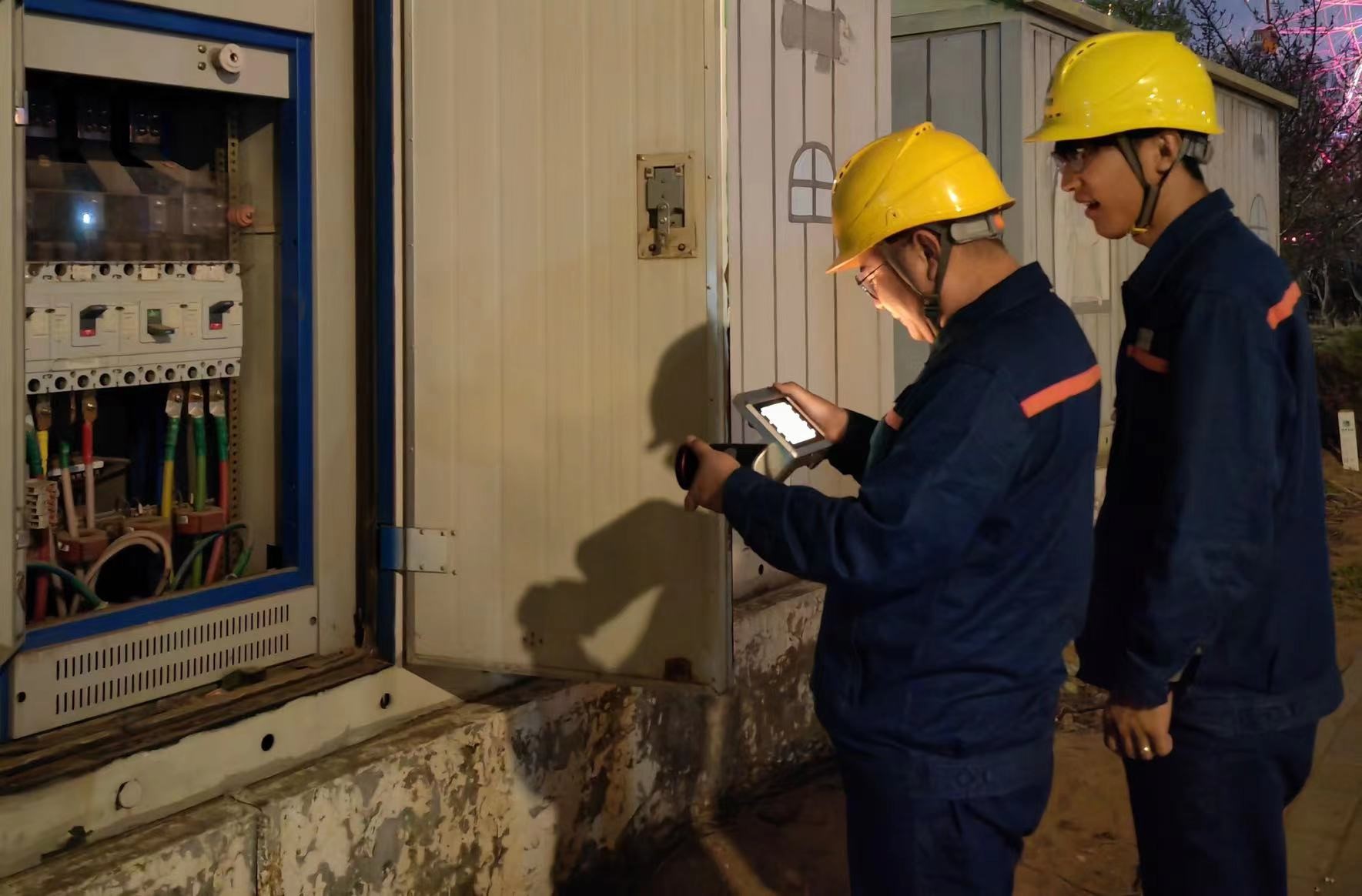 6月24日20時,熙熙攘攘的人群里,郭智遠(yuǎn)和袁小龍穿行其中。今晚,他倆要完成蒙欣廣場和德榮2個夜市的用電安全檢查。“迎峰度夏期間工作量大,全憑兩條腿,必須要到現(xiàn)場實(shí)際檢查才能放心。”他們利用紅外測溫儀通過電暈、局部放電、溫升燒紅等現(xiàn)象來發(fā)現(xiàn)導(dǎo)線連接器及絕緣子存在的缺陷。對蒙欣廣場夜市、德榮夜市線路刀閘閘口、接頭、導(dǎo)線線夾等易發(fā)熱部位進(jìn)行全方位檢查,及時掌握設(shè)備運(yùn)行狀態(tài),避免設(shè)備出現(xiàn)故障。結(jié)束了夜市的用電安全檢查,收拾好工器具,已是22:20,但汗流浹背的兩個人并沒有回程,他們還要前往體育館的10千伏線路開展夜巡工作。
