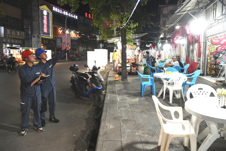 南方電網(wǎng)工作人員檢查夜市小商戶線路。