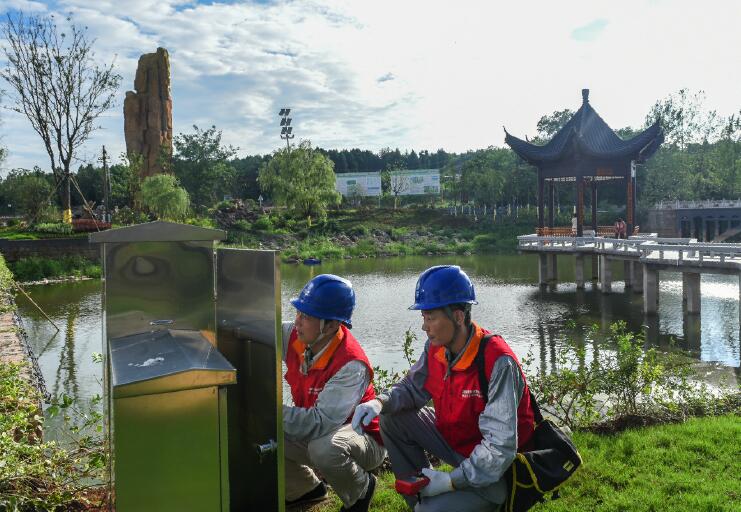 7月18日,在安徽省定遠(yuǎn)縣西卅店鎮(zhèn)“金山溪谷”旅游景點(diǎn),國網(wǎng)滁州供電公司皖美共產(chǎn)黨員服務(wù)隊(duì)員楊海榮、王培雨等對景區(qū)用電設(shè)備開展安全檢查,保障游客人身安全。