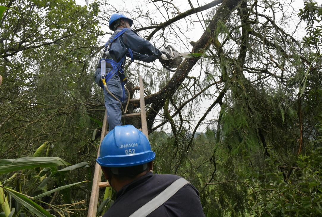 在搶修現(xiàn)場,在做好一系列安全措施以后,配電中心搶修人員用油鋸鋸斷搭在線路的樹木,再登上電桿,拆除原來的線路和刀閘,隨后更換故障刀閘,重新架設(shè)線路,恢復(fù)送電……搶修中,工作人員克服雨天路滑、天氣暴熱、搶修不易等困難,同時在當?shù)卮迕竦亩αχС窒拢?jīng)過三個小時的艱苦鏖戰(zhàn),所有搶修工作圓滿落下帷幕。