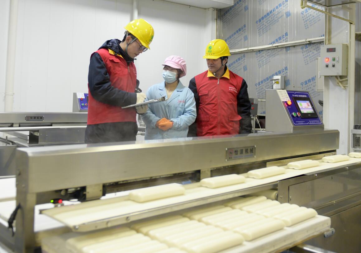 走進年糕生產(chǎn)車間,一條條生產(chǎn)線正全線運行。“制作年糕要經(jīng)過浸米、磨粉、壓干、上蒸等多道工序。”余元國介紹,隨著生產(chǎn)工藝的逐步改進,現(xiàn)在每個環(huán)節(jié)都實現(xiàn)了電氣化,可以通過淘米機、打粉機、蒸汽灶等一系列精密的設備來完成,工人們只需在一旁做一些輔助操作,大大地提高了生產(chǎn)效率,去年產(chǎn)值就達到了4000多萬元。