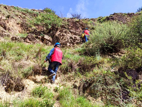 張富進和師傅正在“翻山越嶺”去巡線