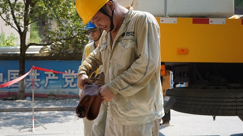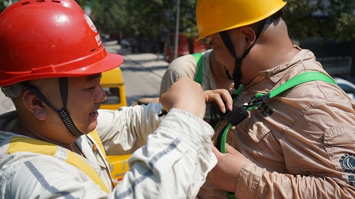 “帶電作業(yè)的方法有三種,分別是中間電位作業(yè)法、地電位作業(yè)法以及等電位作業(yè)法,今天我們采用的中間電位作業(yè)法。今天天氣不錯,雖然溫度高,但濕度低,能夠滿足帶電作業(yè)條件。帶電作業(yè)必須身著密不透風的絕緣套裝,在高溫下,作業(yè)人員體感往往會達到60℃。雖然辛苦,但只要能少停電,盡可能的給人民群眾帶去清涼,再苦再累都值得。”帶電作業(yè)班班長張敏說道。