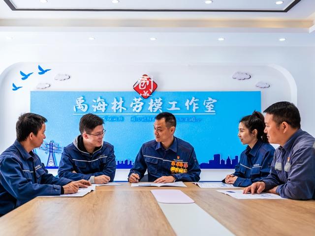 禹海林和同事在“眾智樓”開展技術(shù)創(chuàng)新探討。謝超宇攝