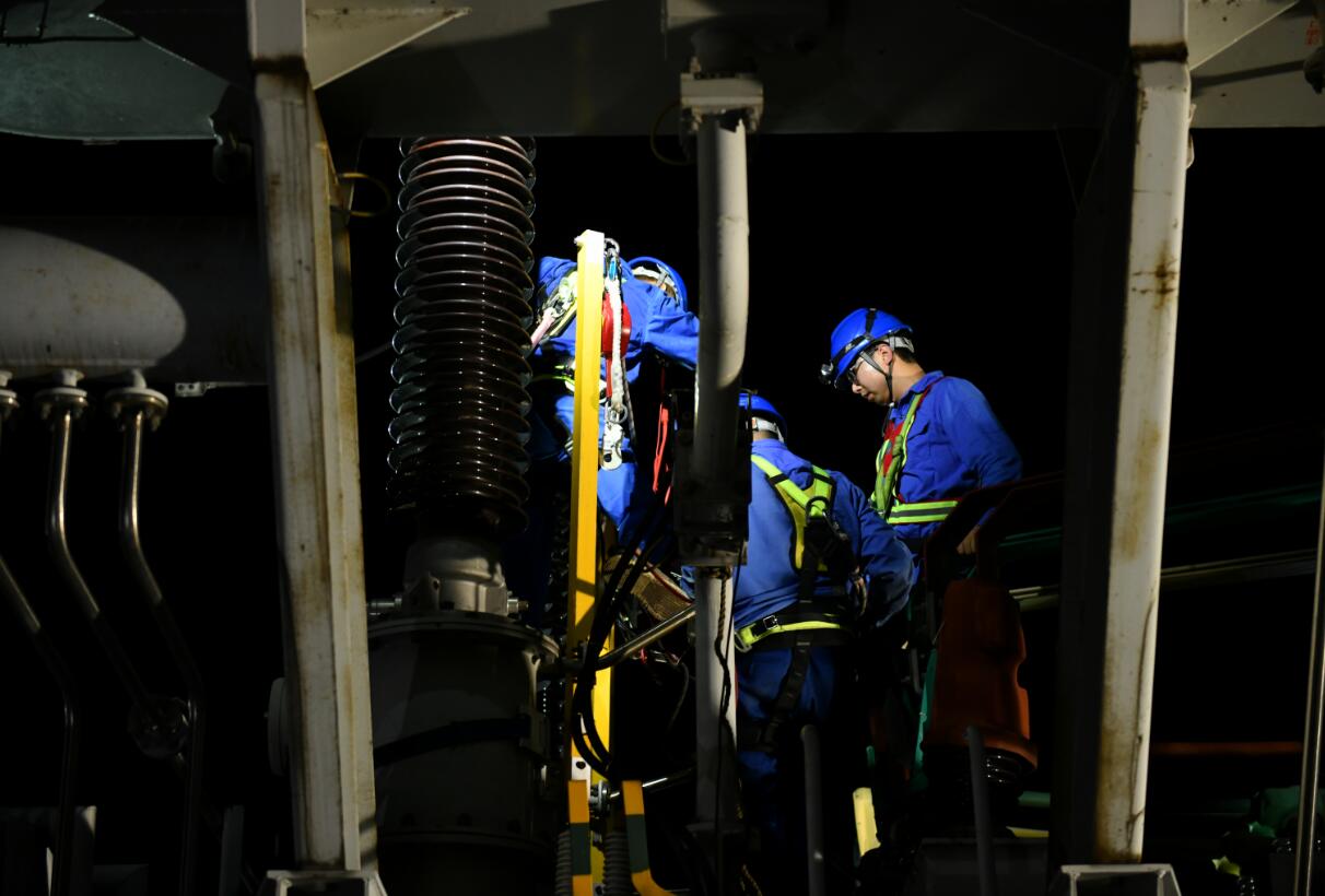 晚上19時(shí)23分,牟山變2號主變停役,消缺工作正式開始,變電運(yùn)維人員在做好停電、驗(yàn)電、掛設(shè)接地線和裝設(shè)安全圍欄等安全措施后,7名檢修人員爬上了主變,輪流開展搶修工作。當(dāng)天正值浙江入伏第一天,即使是晚上,仍有著30多度的高溫,悶熱的天氣和無處不在的蚊蟲給搶修工作帶來了不小的影響,不一會他們后背已經(jīng)悄然濕透,隨手一拍就是帶血的蚊子。