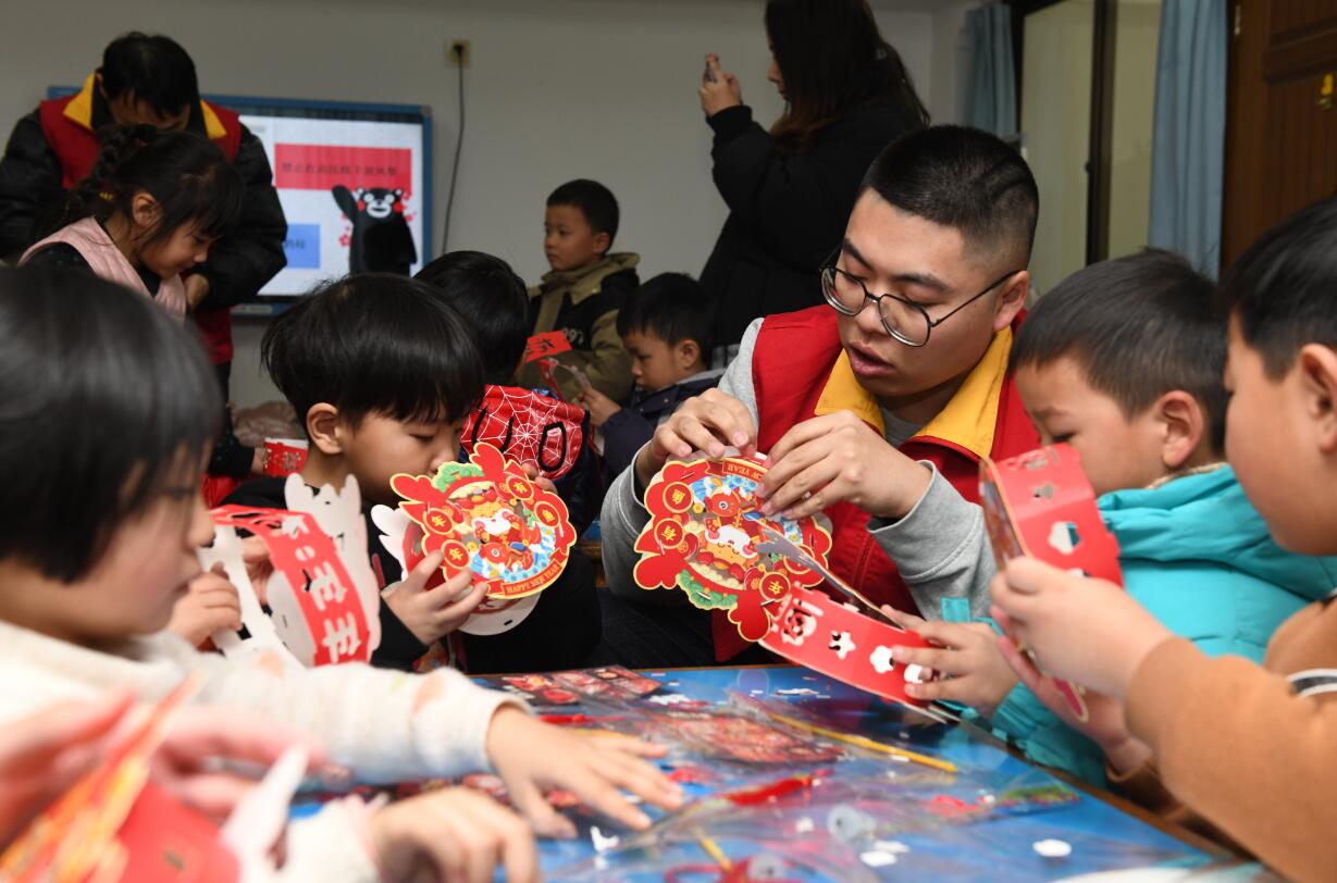 隨后,志愿者與孩子們還分組一起動手制作了“龍年小燈籠”,在志愿者的指導(dǎo)一下,整理素材、拼接卡紙、綁流蘇……孩子們一步步依次組裝。制作過程中,孩子們異常興奮,有說有笑,不一會兒他們就制作完成一盞盞漂亮的小燈籠??粗约旱膭趧映晒?,孩子們的笑臉更加燦爛了。