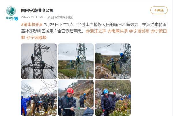 央視網(wǎng)消息:據(jù)@國(guó)網(wǎng)寧波供電公司 微博消息,2月29日下午1點(diǎn),經(jīng)過(guò)電力搶修人員的連日不懈努力,寧波受本輪雨雪冰凍影響區(qū)域用戶(hù)全面恢復(fù)用電。