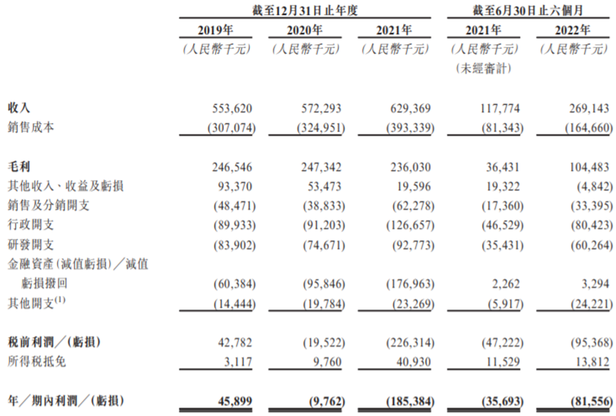 招股書顯示,2019年至2021年,億華通營收分別為約5.54億元、5.72億元、6.29億元,期內利潤分別為約4589.9萬元、-976.2萬元、-1.85億元。進入2022年,億華通在上半年的營收和期內利潤分別達到2.69億元及-8155.6萬元。