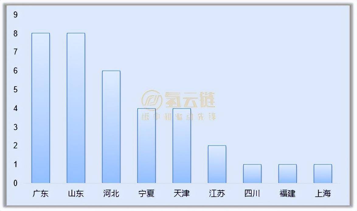 隨著全國氫能產(chǎn)業(yè)的進一步發(fā)展,氫能產(chǎn)業(yè)已成為各省低碳和經(jīng)濟發(fā)展的重要力量。據(jù)氫云鏈統(tǒng)計,已發(fā)布的9個省份中均有氫能產(chǎn)業(yè)項目,共涉及35項,涵蓋整個產(chǎn)業(yè)鏈,其中在項目數(shù)上山東和廣東遙遙領(lǐng)先。氫云鏈分析相關(guān)項目的特點如下: