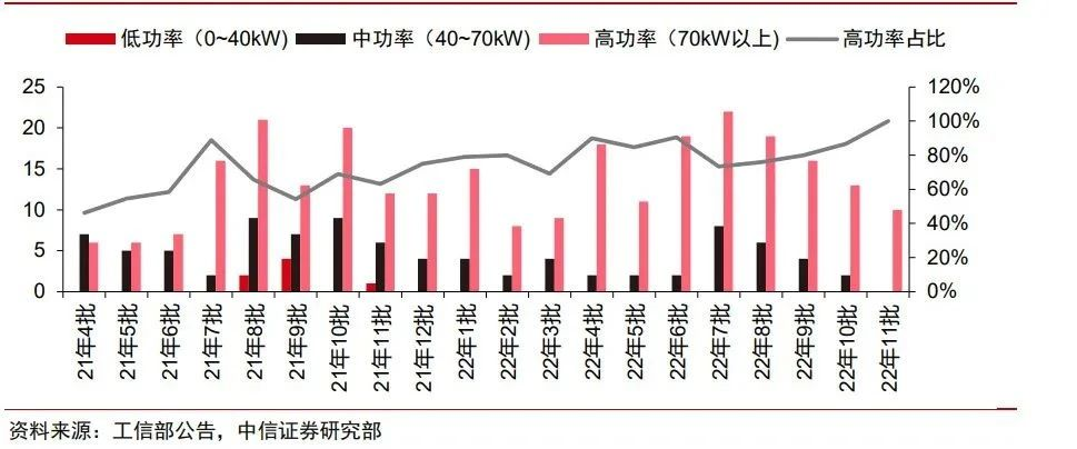 入圍車型延續(xù)了高功率化的趨勢。車型結構方面,根據(jù)中信保上險量數(shù)據(jù),顯示2022年1~11月客車占比從1月的83%逐漸縮減到11月的9%,重卡占比從1月的9%逐漸增加到11月的51%,并且2022年1~3Q重卡主要在氫能源較為豐富的地區(qū)推廣,我們認為重卡有望繼續(xù)保持主導地位并率先實現(xiàn)經(jīng)濟性。