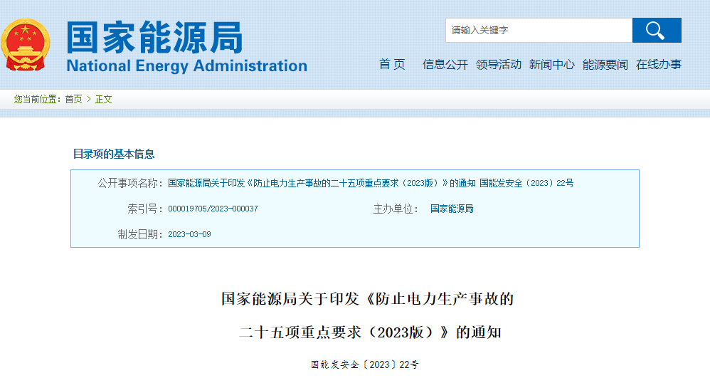 國家能源局關(guān)于印發(fā)《防止電力生產(chǎn)事故的二十五項(xiàng)重點(diǎn)要求(2023版)》的通知