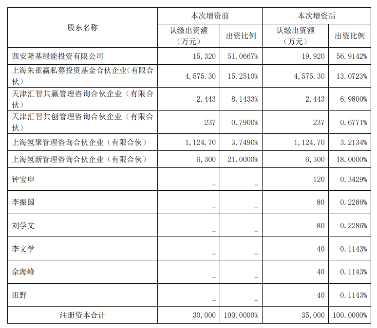 公告顯示,基于對隆基氫能未來發(fā)展的信心,根據(jù)經(jīng)營需要,公司通過全資子公司隆基投資向其控股子公司隆基氫能增資4.6億元,其中4600萬元增加隆基氫能注冊資本,4.14億元計入隆基氫能資本公積;公司董事、高級管理人員及經(jīng)營團隊核心管理人員鐘寶申、李振國、劉學(xué)文、李文學(xué)、佘海峰、田野六人向隆基氫能增資4000萬元,其中400萬元增加隆基氫能注冊資本,3600萬元計入隆基氫能資本公積。本次合計增資5億元,其中5000萬元增加隆基氫能注冊資本,4.5億元計入隆基氫能資本公積,本次增資完成后,隆基氫能的注冊資本將增加至3.5億元。