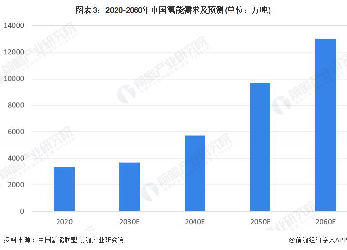根據(jù)中國氫能聯(lián)盟的預測,2020 年以后中國氫能需求將持續(xù)增加,尤其是 2030 年以后,為達成 " 碳中和、碳達峰 " 的目標,氫能需求量將大增。到 2060 年,中國氫能年需求將超過 1.3 億噸。