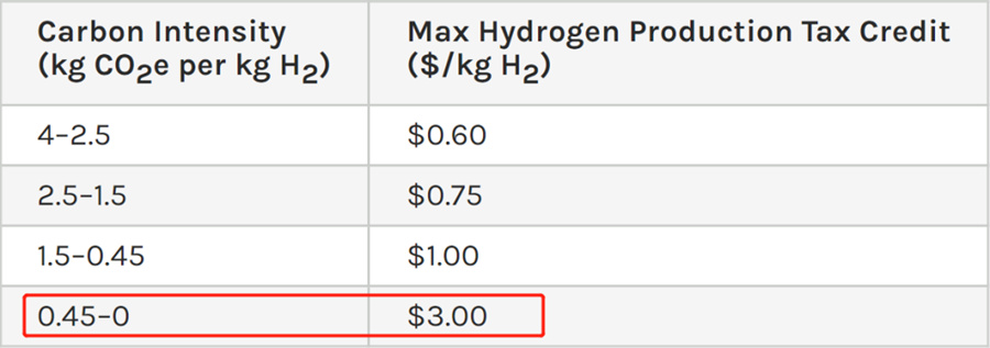 根據(jù)氫氣生產(chǎn)路徑碳強(qiáng)度的不同,稅收抵免激勵(lì)程度也不同,比如如果生產(chǎn)1千克的氫氣只排放0-0.45千克的二氧化碳當(dāng)量,就可以獲得3美元/公斤的最高補(bǔ)貼。并且,綠氫項(xiàng)目還可申請(qǐng)最高30%的投資稅收抵免。