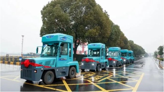在張家港港務(wù)集團(tuán)港埠分公司倉庫內(nèi),5臺氫燃料港口專用牽引車一字排開,整齊壯觀。這些牽引車長3.8米、寬2米、高3米,屬于非道路移動機械,主要用于港區(qū)內(nèi)件雜貨水平運輸作業(yè)。它們的最大牽引載重量可達(dá)60噸,在氫瓶充滿的情況下可至少連續(xù)運行8小時,還擁有噪音低、操作舒適等特點,其排放物為純凈水并采用一鍵自動排水設(shè)計。