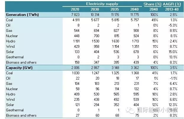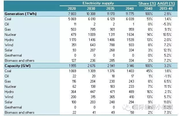 2040 年一次能源供應達到46.95億噸標油,其中煤炭占51%、石油16%、天然氣13%、核電5%、水電3%、非水可再生能源12%。從發(fā)電量來看,2040年總裝機達3145吉瓦,發(fā)電量達11.78萬億千瓦時,煤電占56%、天然氣發(fā)電9%、核電8%、水電13%、風電8%、光伏3%、生物質(zhì) 3%。