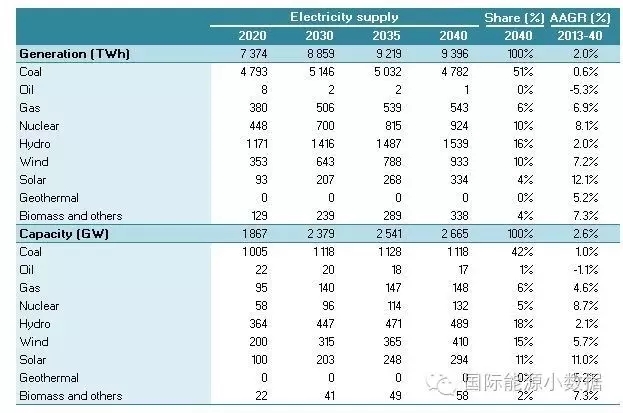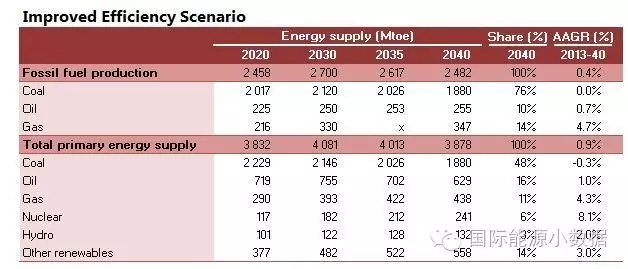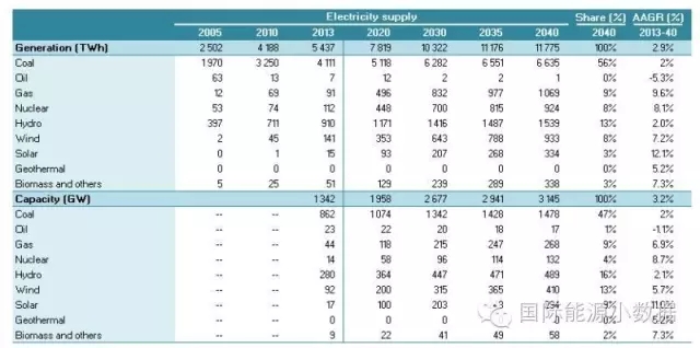 在大大提高能效的情境下,2040年一次能源供應只有38.78億噸標油,其中煤炭仍占48%、石油16%、天然氣11%、核電6%、水電3%、非水可再生能源14%。從發(fā)電量來看,2040年總裝機達2665吉瓦,發(fā)電量達9.39萬億千瓦時,煤電占51%、天然氣發(fā)電6%、核電10%、水電16%、風電 10%、光伏4%、生物質(zhì)4%。