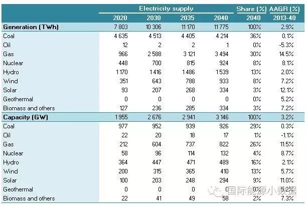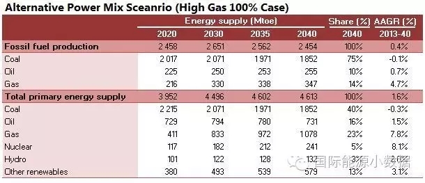 在大力推廣天然氣發(fā)電的情境下,2040年一次能源供應為46.13億噸標油,其中煤炭跌至40%、石油16%、天然氣高達23%、核電5%、水電3%、非水可再生能源13%。從發(fā)電量來看,2040年總裝機達3146吉瓦,發(fā)電量達11.78萬億千瓦時,煤電占36%、天然氣發(fā)電30%、核電8%、水電 13%、風電8%、光伏3%、生物質(zhì)3%。