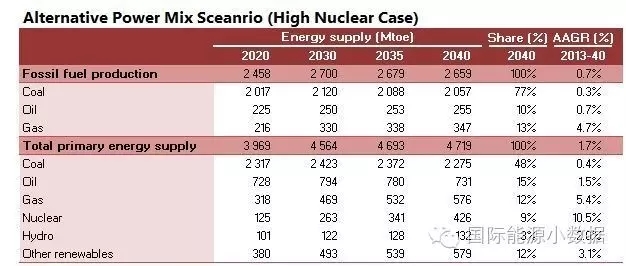 在高核電比例的情境下,2040年一次能源供應達到47.19億噸標油,其中煤炭占48%、石油15%、天然氣12%、核電9%、水電3%、非水可再生能源12%。從發(fā)電量來看,2040年總裝機達3146吉瓦,發(fā)電量達11.78萬億千瓦時,燃煤發(fā)電占51%、天然氣發(fā)電8%、核電14%、水電13%、風電8%、光伏3%、生物質(zhì)3%。