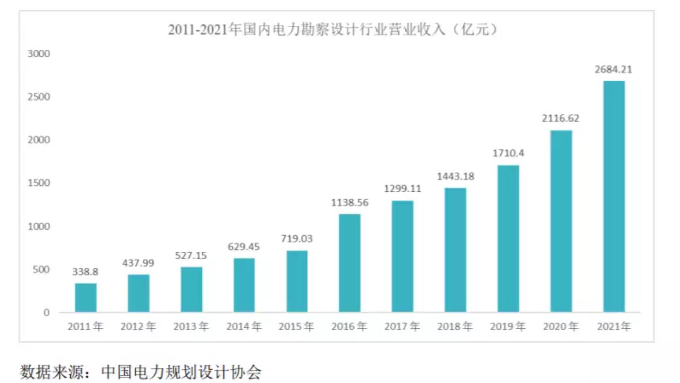 招股書顯示,根據(jù)中國電力規(guī)劃設(shè)計協(xié)會發(fā)布的電力勘察設(shè)計行業(yè)各年度統(tǒng)計數(shù)據(jù)顯示,2021年,電力勘察設(shè)計行業(yè)實現(xiàn)營業(yè)收入2,684.21億元,同比增長26.82%。