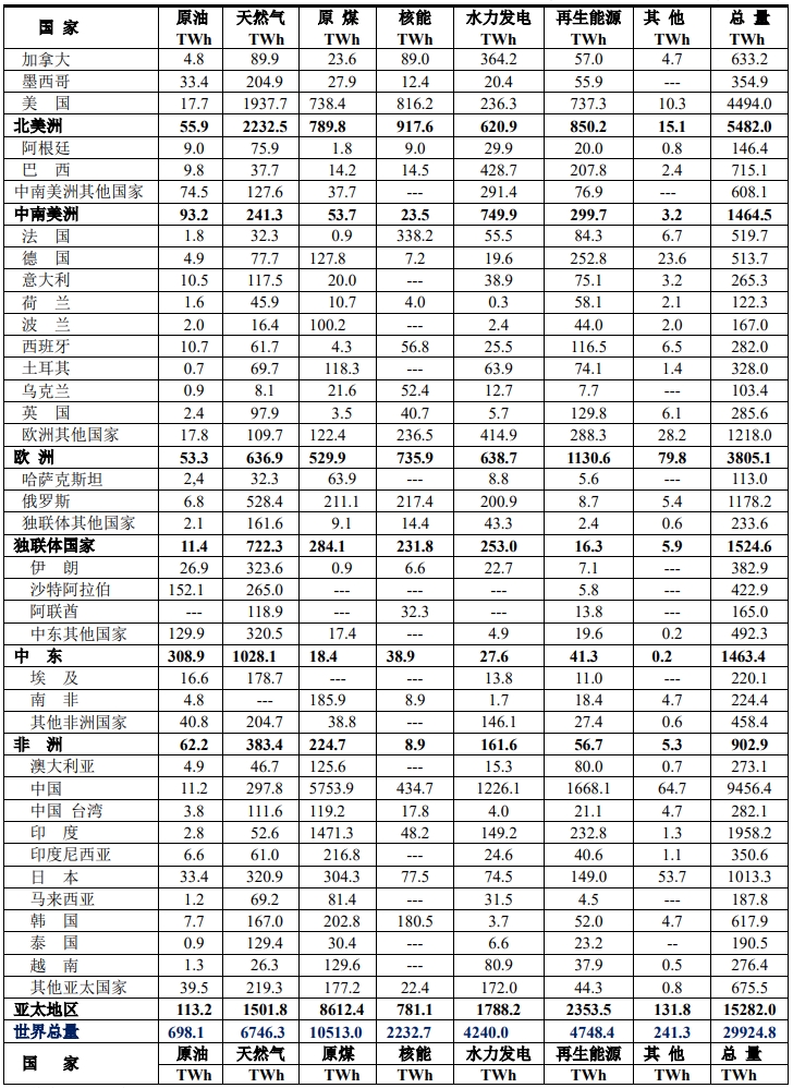 表1 2023年世界各國電力結(jié)構(gòu) (以發(fā)電量TWh表示)