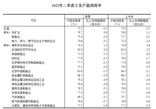 分三大門類看,二季度,采礦業(yè)產(chǎn)能利用率為76.7%,比上年同期上升0.6個百分點;制造業(yè)產(chǎn)能利用率為75.4%,下降3.4個百分點;電力、熱力、燃氣及水生產(chǎn)和供應業(yè)產(chǎn)能利用率為70.6%,下降4.1個百分點。