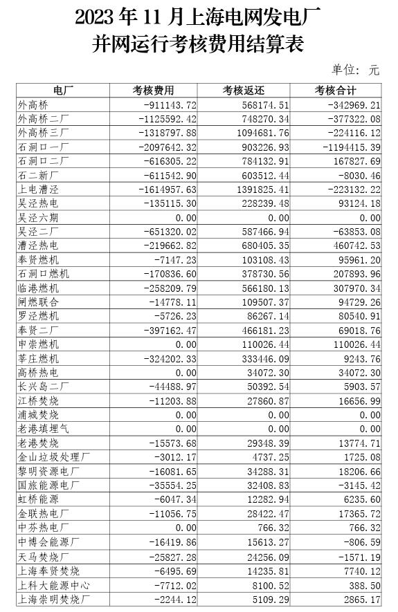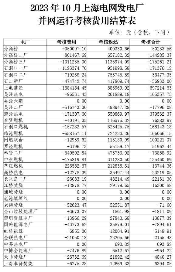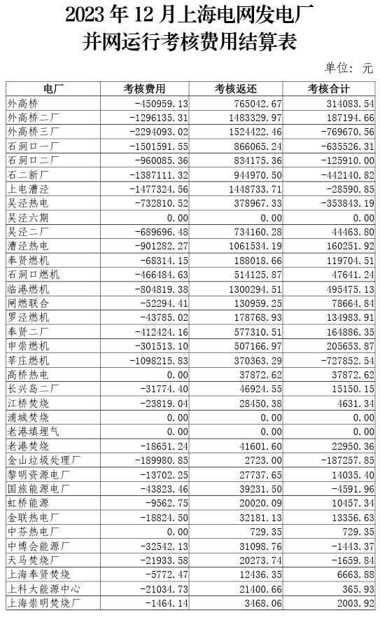 2023年10-12月上海電網(wǎng)發(fā)電廠并網(wǎng)運行考核費用結(jié)算表