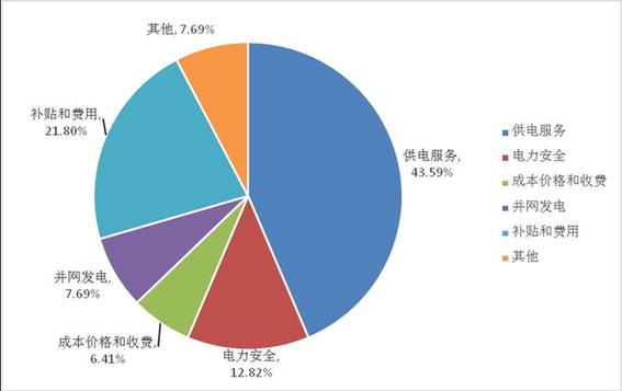 按業(yè)務(wù)類(lèi)別分類(lèi):供電服務(wù)類(lèi)34件,占43.59%;電力安全類(lèi)10件,占12.82%;成本價(jià)格和收費(fèi)類(lèi)5件,占6.41%;并網(wǎng)發(fā)電類(lèi)6件,占7.69%;補(bǔ)貼和費(fèi)用類(lèi)17件,占21.80%;其他類(lèi)6件,占7.69%。